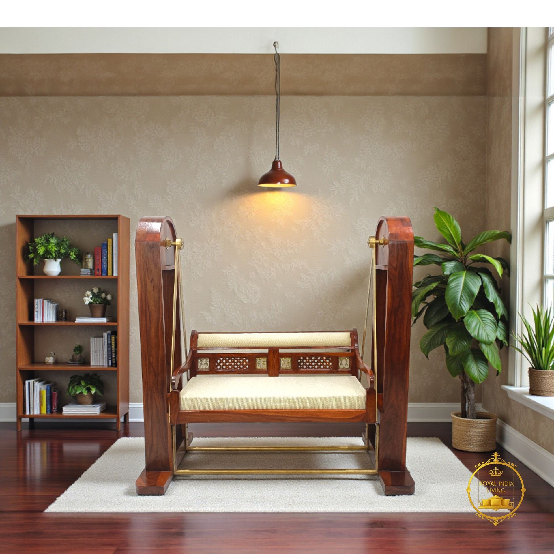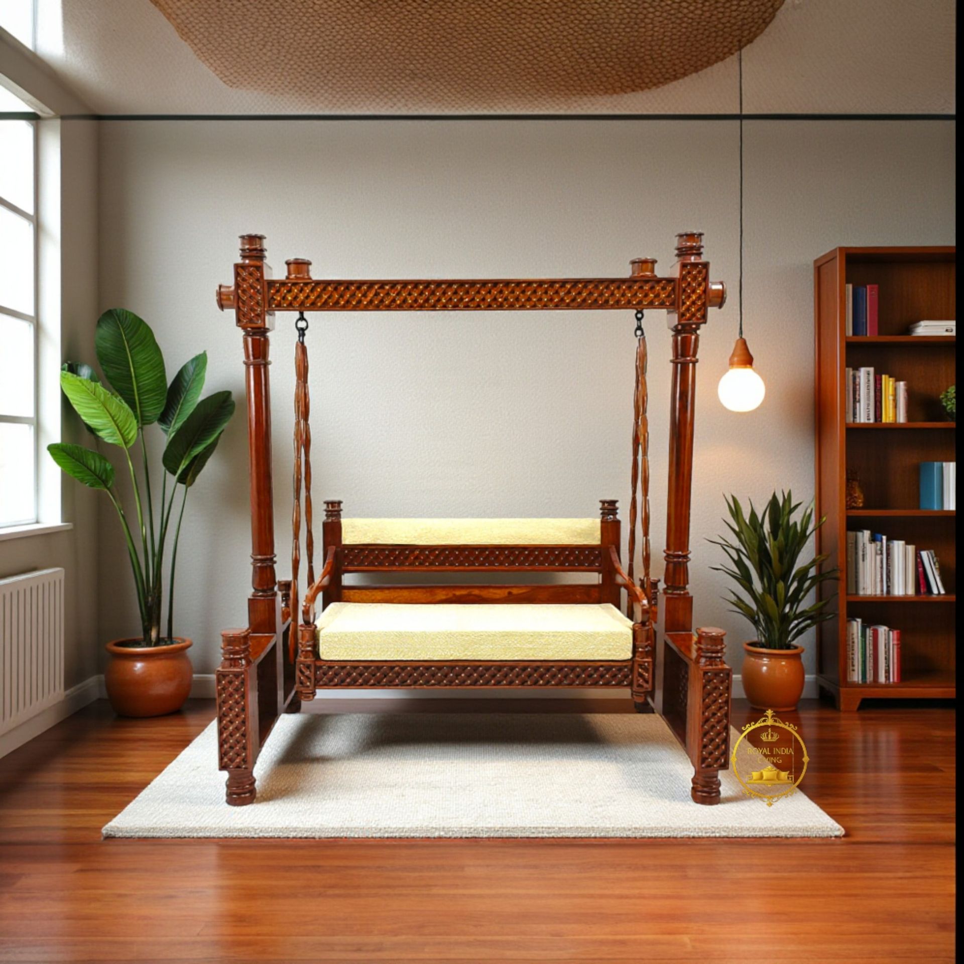 This premium Sheesham wood swing (Jhula) is handcrafted by skilled artisans in Bikaner, Rajasthan, showcasing traditional Indian craftsmanship with a refined modern finish.